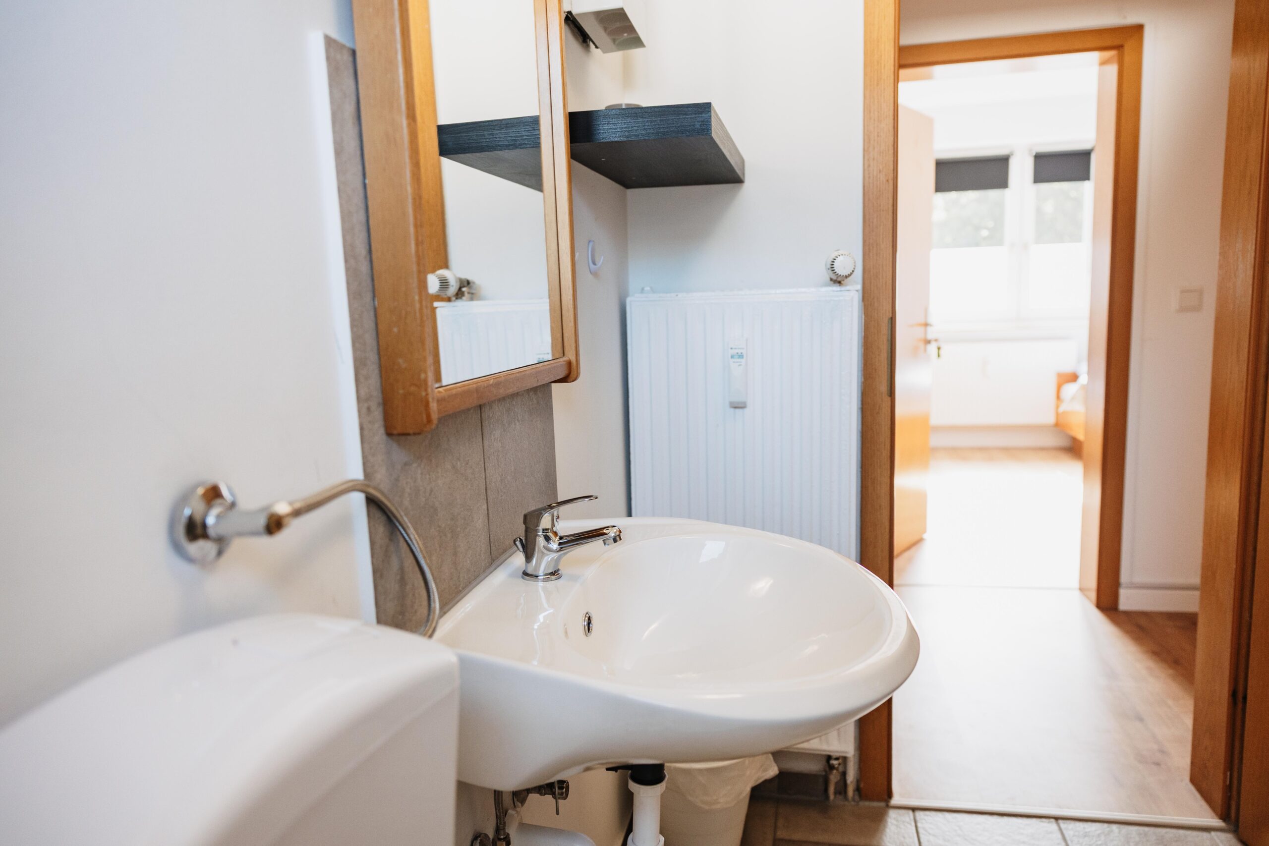Die Wohnung hat ein Gemeinschafts-Badezimmer mit Dusche, Waschbecken und WC. In der vollausgestatteten Küche finden Sie alles, was Sie zum Kochen benötigen, Elektroherd mit Backofen, Spülmaschine, Kühlschrank, Gefrierschrank, Mikrowelle, Kaffeemaschine, Wasserkocher, Toaster und alle wichtigen Küchenutensilien.