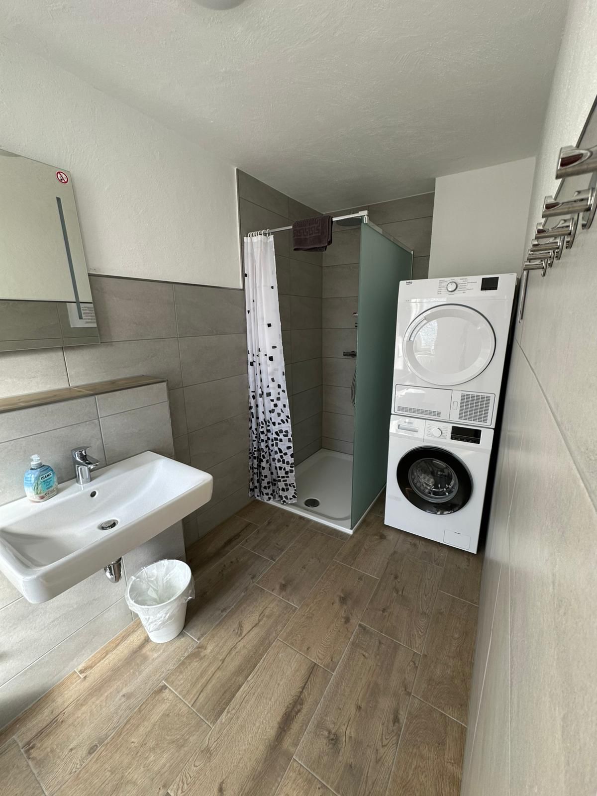 Das Bad verfügt über eine geräumige Dusche, WC, Waschbecken, Waschmaschine und Wäschetrockner (die kostenfrei genutzt werden können).